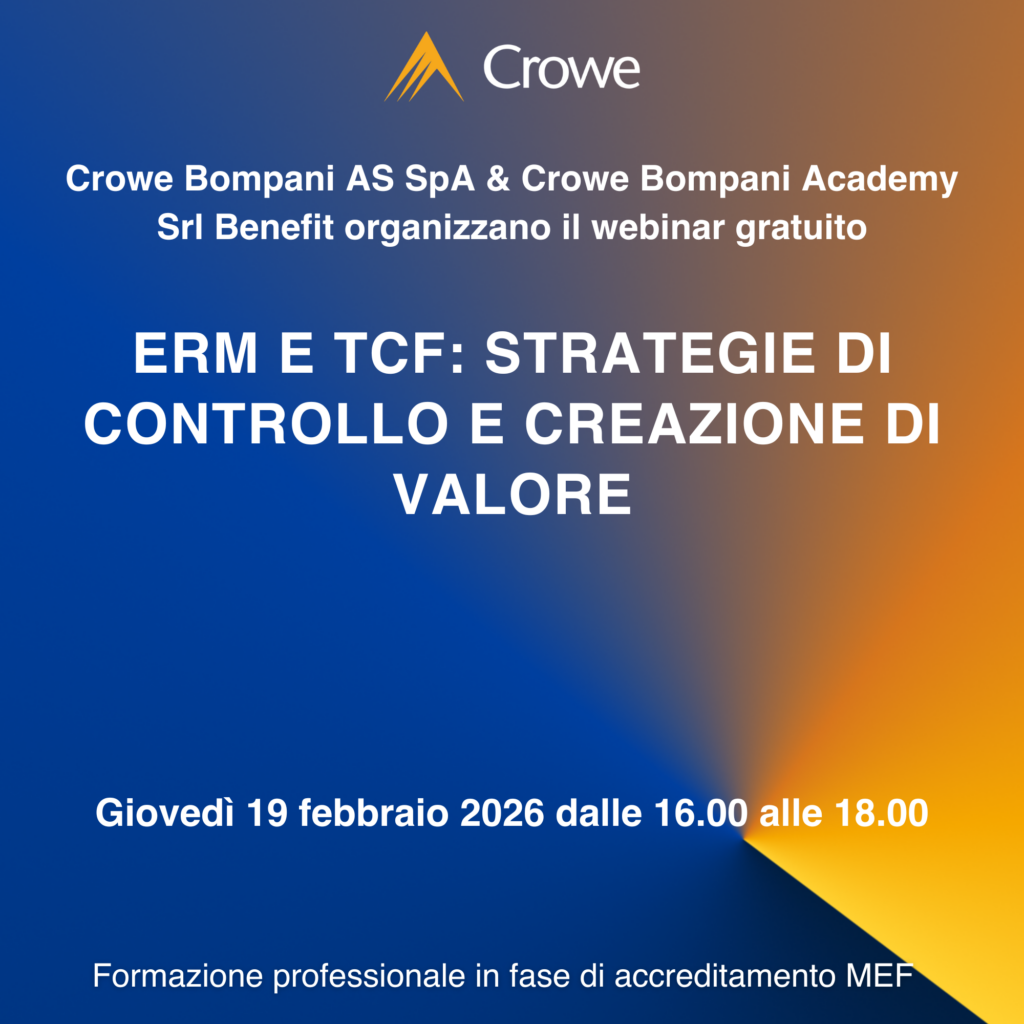 Scopri di piùDal 2005 Crowe Bompani fa parte di Crowe Global, tra i primi 10 network di revisione e consulenza al mondo. Oggi Crowe Bompani è una realtà in continua evoluzione costituita da quattro Società: Crowe Bompani Assurance Services SpA e Crowe Bompani Srl a Socio Unico, che opera nel panorama dei servizi di revisione legale e assurance, Crowe Bompani Advisory Srl che fornisce ai clienti consulenza in diversi ambiti quali Corporate Finance, Digital Transformation, ESG, Risk Management & Compliance, Forensic Accounting e da Crowe Bompani Academy Srl Benefit, che offre alle aziende clienti la formazione o l’aggiornamento professionale utile ad aumentare le competenze delle proprie risorse.