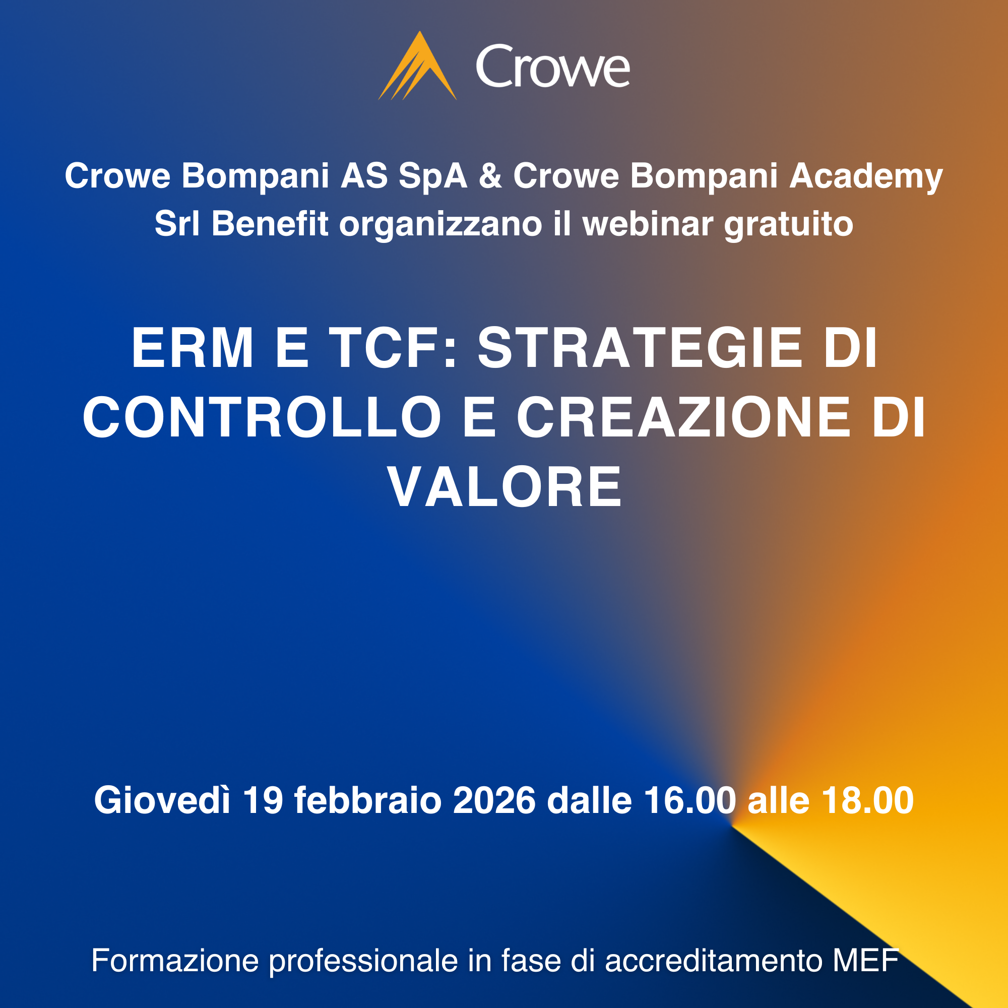 Per supportare le aziende in questo percorso, Crowe Bompani Academy propone un webinar gratuito pensato per offrire una visione chiara e operativa dell’integrazione tra ERM e TCF e del loro ruolo nei processi decisionali aziendali.