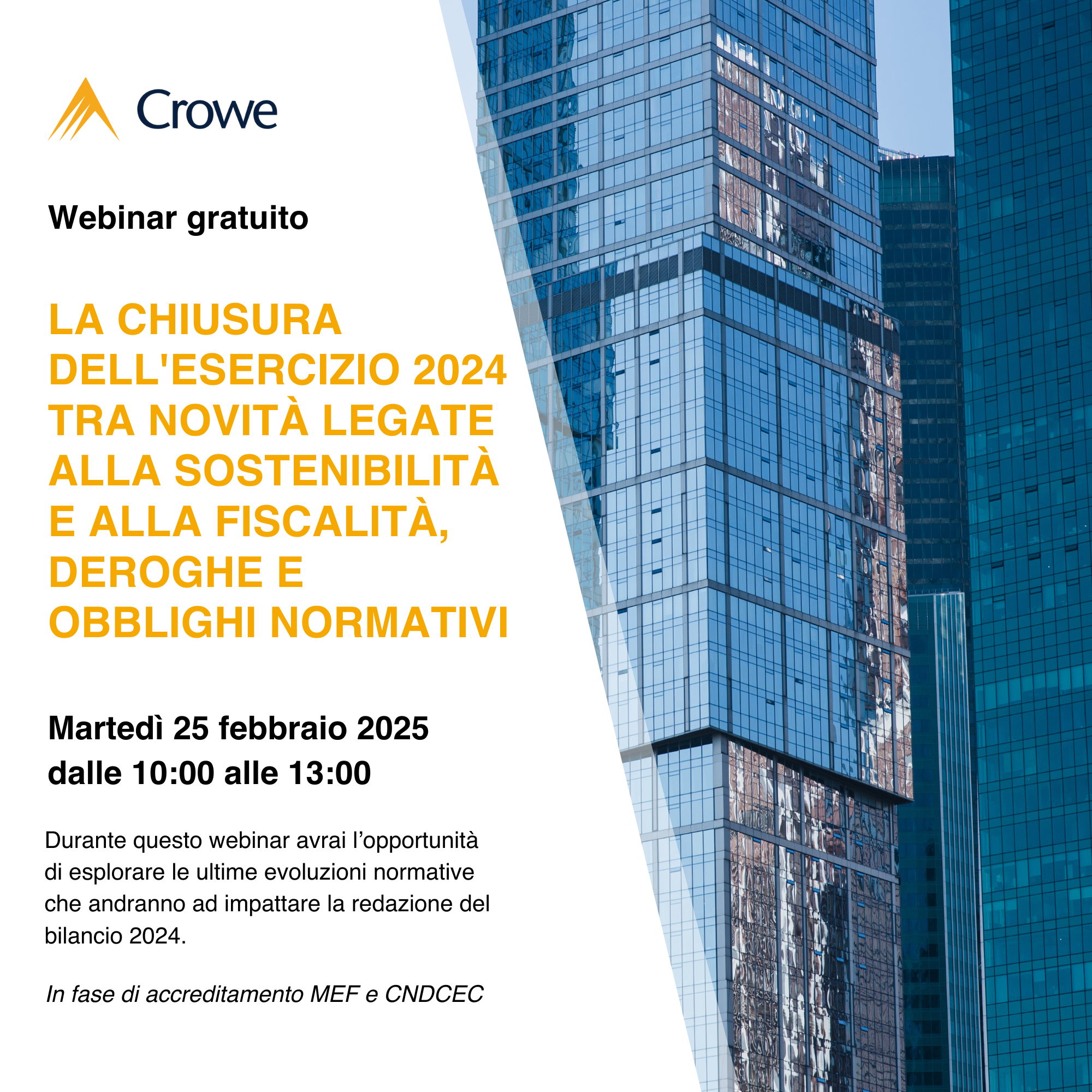 Il 25 febbraio 2025 dalle 10.00 alle 13.00 per agevolare la presentazione del bilancio 2024 Crowe Bompani Academy Srl Benefit si propone di fornire una panoramica delle principali normative che andranno ad impattare sulla redazione dei documenti contabili attraverso il webinar gratuito “La chiusura dell’esercizio 2024 tra novità legate alla sostenibilità e alla fiscalità, deroghe e obblighi normativi“.